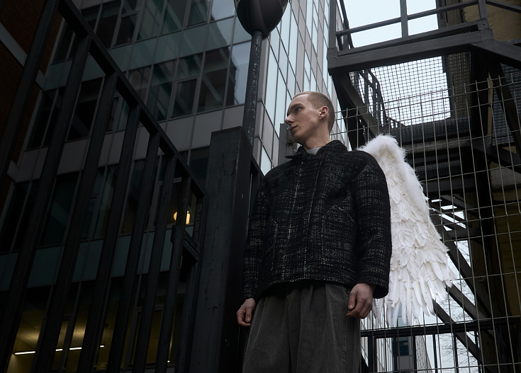 Другой ассоциацией стали рубашки с полоской, похожей на railway stripe — узором, связанным не только с домашним уютом, но и с железнодорожными работниками. Этот выбор не случаен: по первому образованию Ольга Васюкова — инженер путей сообщения. Не упустили и современность европейской моды, перекидывая мост из прошлого в настоящее: рабочие куртки выполнены как в современном обработанном канвасе, так и в чёрно-белом букле.