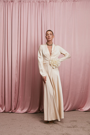 В капсулу вошли новые модели и переосмысленные силуэты бренда в более чувственном праздничном настроении: женственные комплекты и платья из тактильных тканей с плавной драпировкой. Палитра строится вокруг молочных, пудровых и глубоких тёмных оттенков, с акцентом на нежность, фактуру и настроение особенного февральского дня.