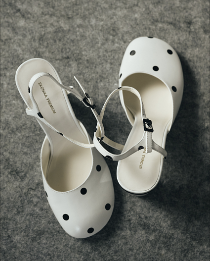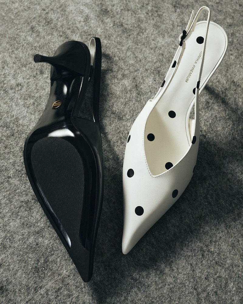 Центральное место в капсуле занимают слингбэки — современная интерпретация классических силуэтов 50–60-х годов с игривой деталью в виде принта polka dot. Удлиненная носочная часть визуально вытягивает ногу, тонкий каблук придает силуэту легкость, регулируемый ремешок обеспечивает точную посадку. Эту линию продолжают акцентные аксессуары: от шелковых платков и галстуков до миниатюрных бьюти- кейсов. Все — с изящным «горошком».