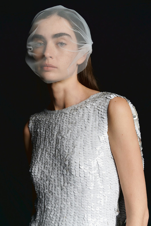 В коллекции использованы плотный шёлк-сатин, итальянский дюшес, газары, шифоны и многослойные тюли. Контраст фактур становится ключевым приёмом: гладкая поверхность корсета соседствует с кружевной аппликацией, пайеточная ткань — с архитектурной драпировкой.