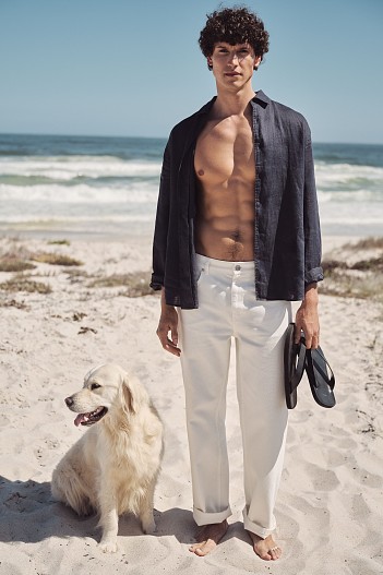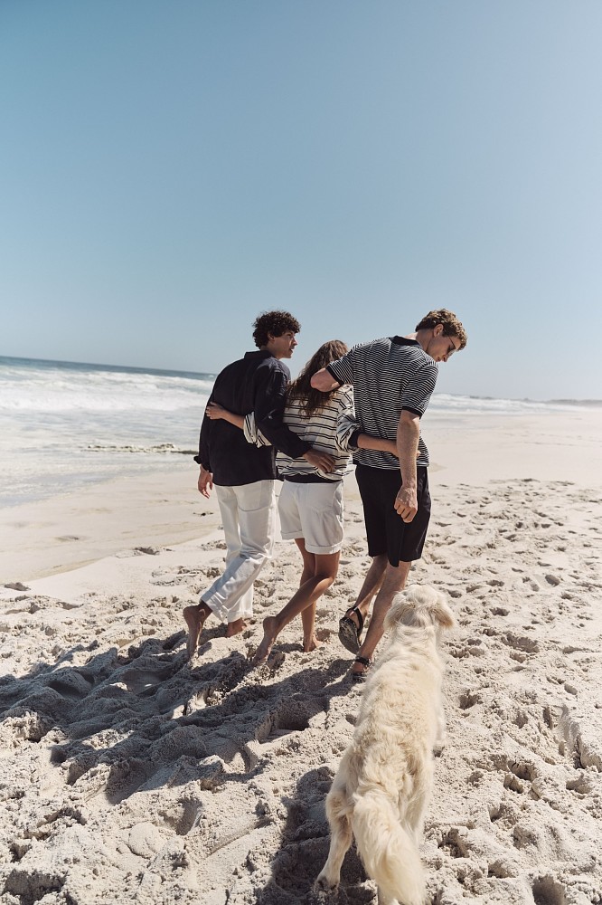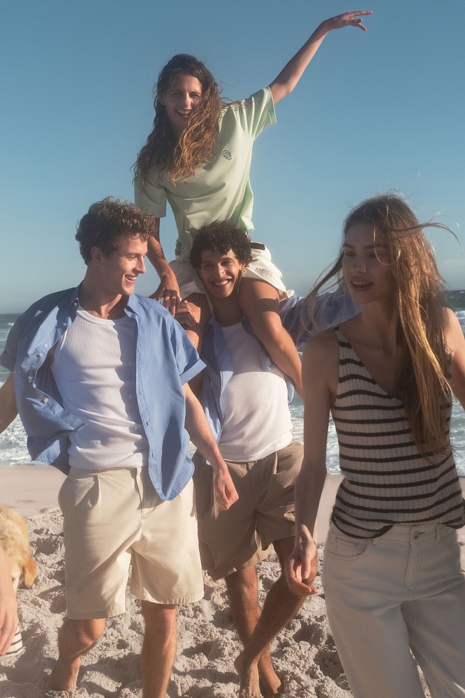 Среди новинок мужской линии — базовые майки и рубашки, джинсы разных силуэтов, удлиненные шорты, а также несколько изделий в полоску — хлопковый бомбер на молнии, сет в пижамном стиле, поло с контрастной отделкой. Особого внимания заслуживает красная ветровка объемного кроя. К новому сезону в коллекции обуви для мужчин появились кожаные вьетнамки и сандалии.