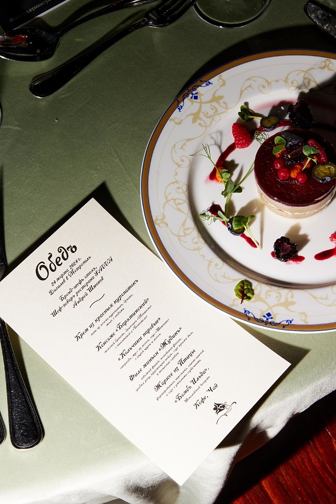 Гостям вечера были предложены блюда, с изыском приготовленные шеф-поваром ресторана SAVVA (1 Звезда Michelin) Андреем Шмаковым и повторяющие меню исторического ужина 1905 года даже в мелочах.