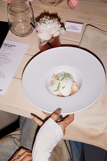 Гостей приветствовал Анатолий Казаков – шеф-повар, обладатель звезды Мишлен, бренд-шеф ресторанов Гвидон и Selfie, после чего презентовал сет закусок из трех блюд.
