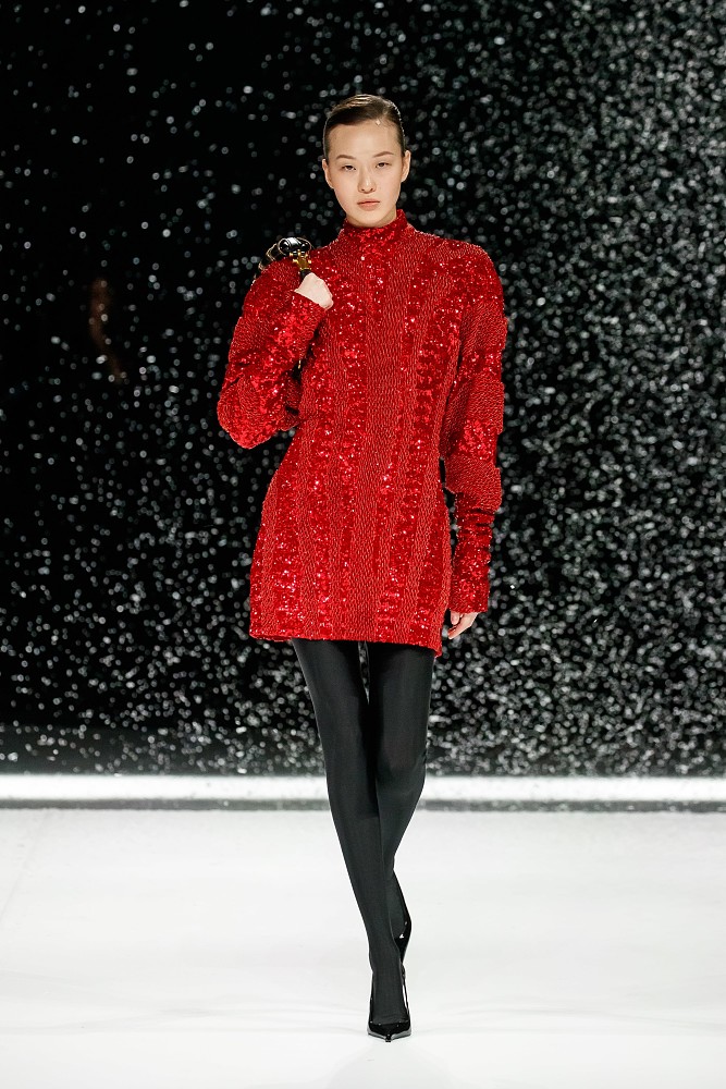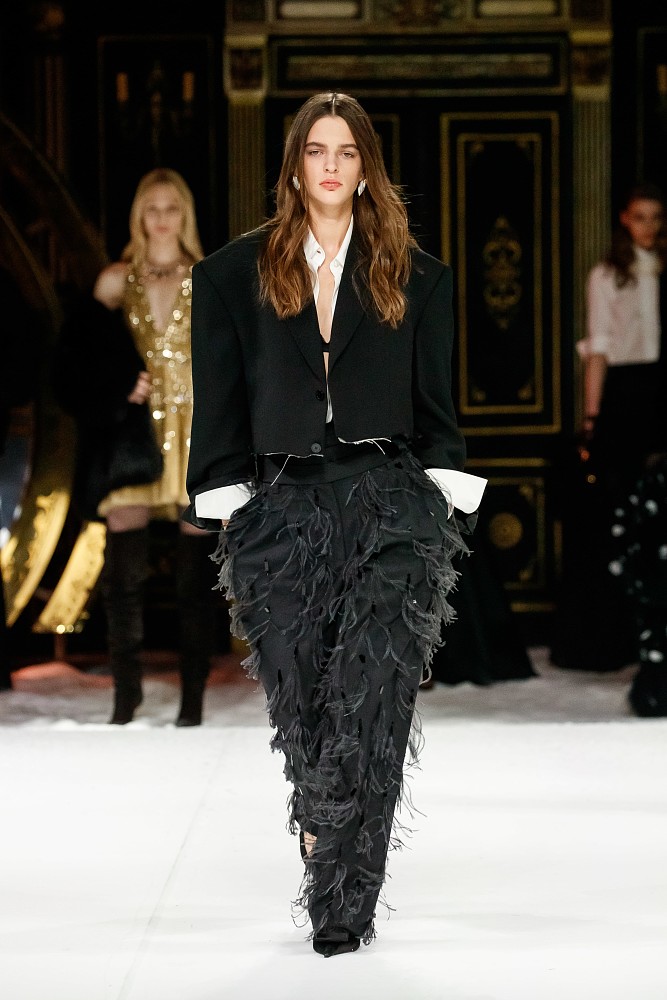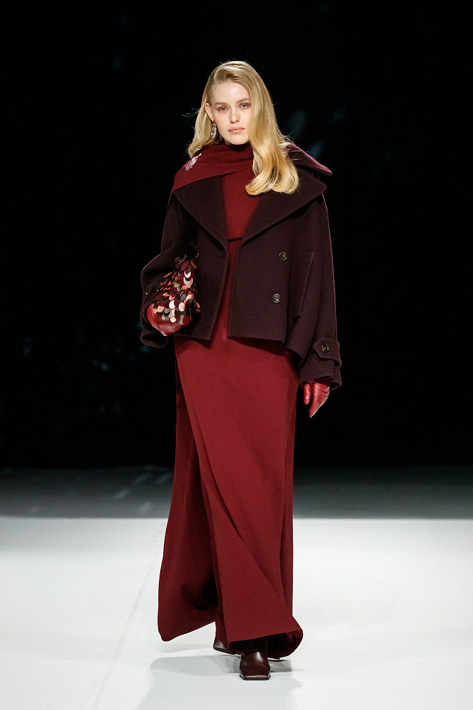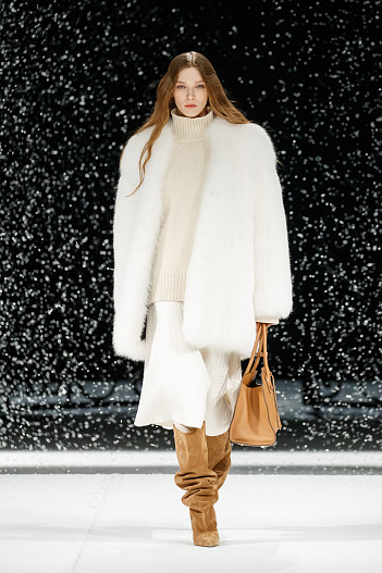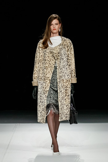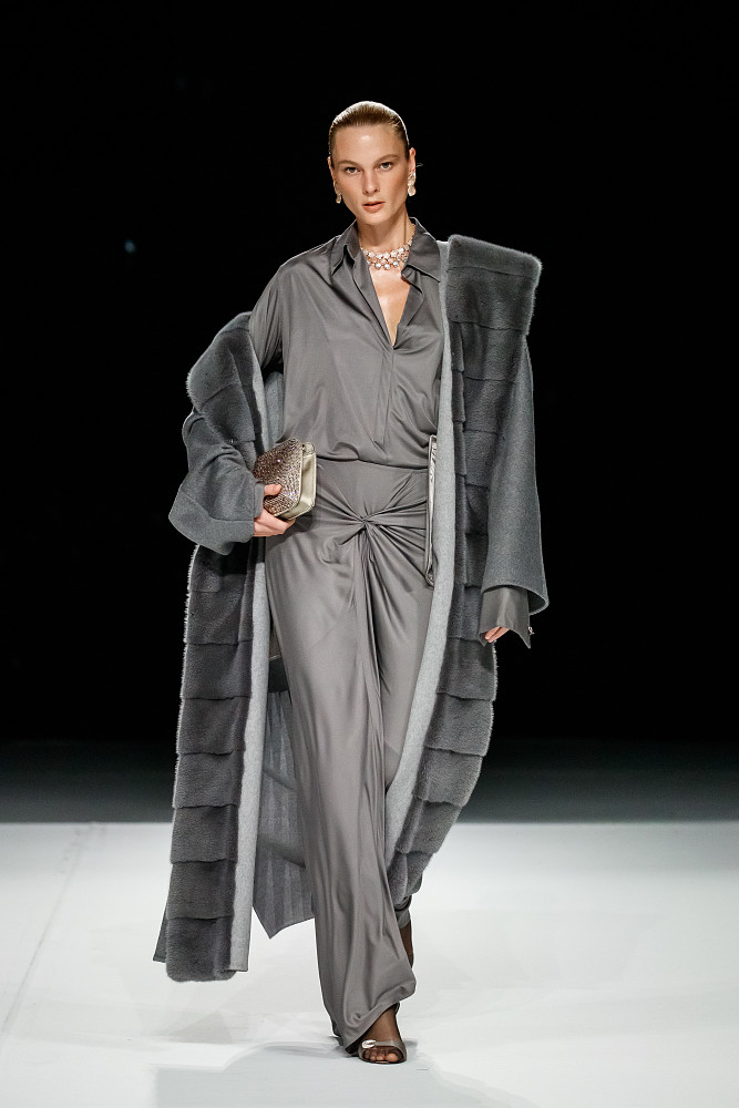 Гости TSUM Fashion Show увидели 69 женских и мужских образов. Показ открыли монохромные образы коричневых и молочных оттенков, в которых акцент был сделан на многослойность. Здесь — объёмные шубы MVST, трикотаж Dolce & Gabbana и Dries Van Noten, шёлковые блузы Chloé у женщин и плотные шерстяные рубашки Jil Sander у мужчин, структурированные жакеты и расслабленные брюки Saint Laurent, Giorgio Armani и Moschino. Во всех образах ключевую роль играло сочетание фактур: мягкий кашемир становится основой образов из шерсти, блеск шелковых изделий перекликается с лакированной обувью, меховые вставки на верхней одежде контрастируют с массивными украшениями, а плетёные замшевые сумки добавляют тактильности. Ярким акцентом на подиуме стали вариации на тему анималистичного принта — от эффектного кейпа Valentino и строгих комплектов CO до смелых интерпретаций Blumarine и Toteme. Мужские образы были построены на идее интеллектуальной классики: дубленки MVST и пальто Balenciaga, глубокие оттенки шоколада и over-layering, минималистичные аксессуары Bottega Veneta и Jil Sander.