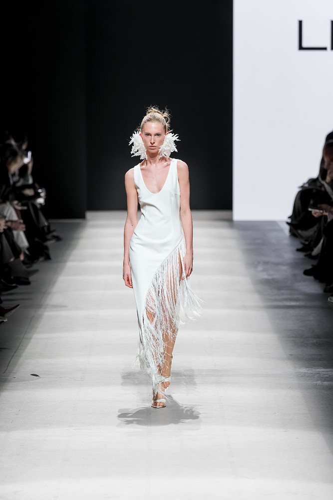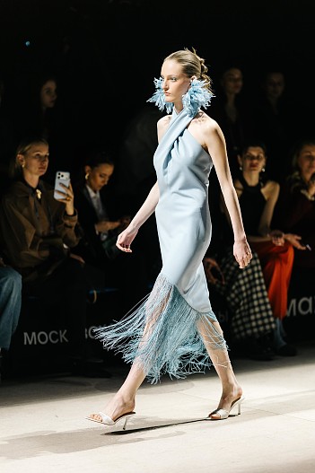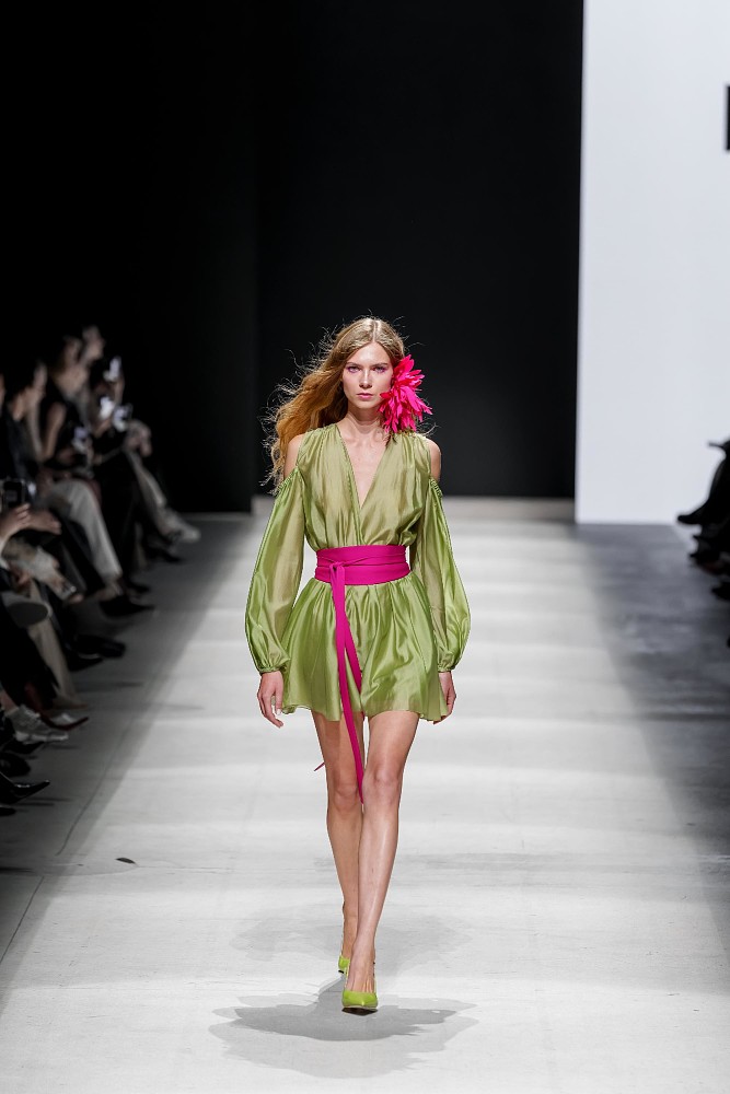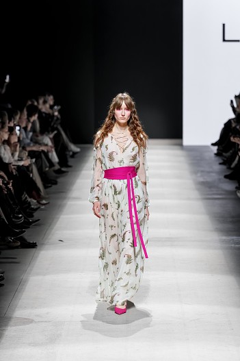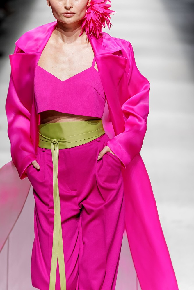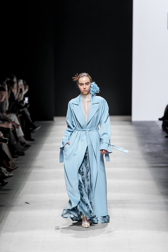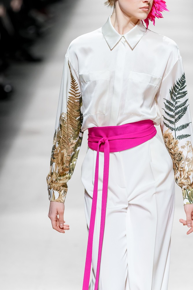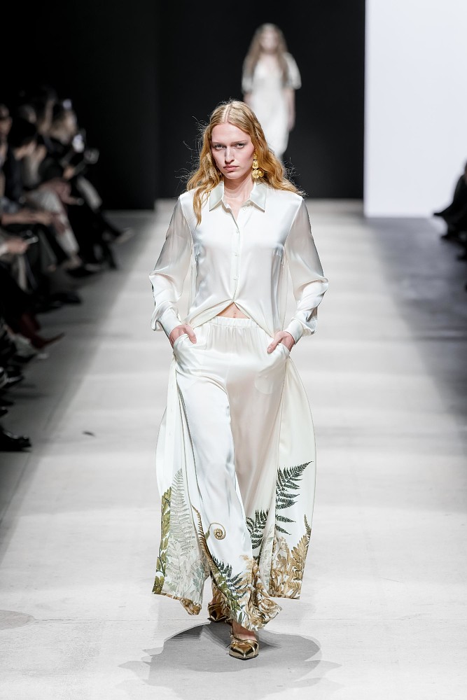 Большое внимание в «Папоротнике» уделено ручной работе: изделия украшены вышивкой с растительным орнаментом из металлизированных и глянцевых нитей — на рукавах и штанинах брючных костюмов, подолах и лацканах. Ряд моделей батистовых платьев дополнен декоративными шарфами с аппликациями, напоминающими листья, а также широкими текстильными ремнями контрастных оттенков. Среди элементов ручного декора встречается и адаптация техники «синель» — это наложенные друг на друга слои сосборенного шифона, напоминающие живую, дышащую поверхность. Из этого материала созданы как утонченные полупрозрачные платья лаконичного кроя, так и сложные кутюрные комплекты с приталенными структурными жакетами. Изысканные легкие тренчи и объемные пальто выполнены из эксклюзивного материала, работа с которым требует высокого уровня мастерства — шелковой органзы.