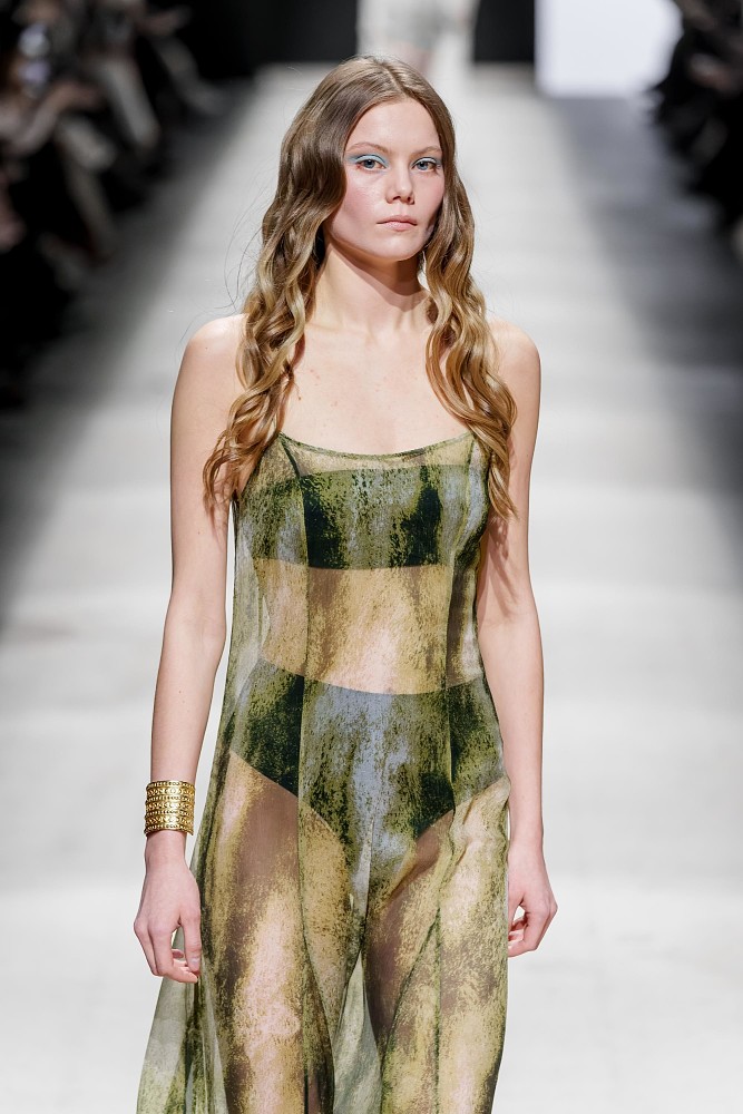 В новом свете раскрывается и трикотаж. Представлены вечерние платья-макси и кардиганы в пол из трикотажа архитектурной вязки с добавлением люрекса — тонкой металлизированной нити оттенка розового золота. Комплекты из расклешенных брюк и ассиметричного топа выполнены из более тяжелого и фактурного варианта, отсылающего к эстетике 70-х.