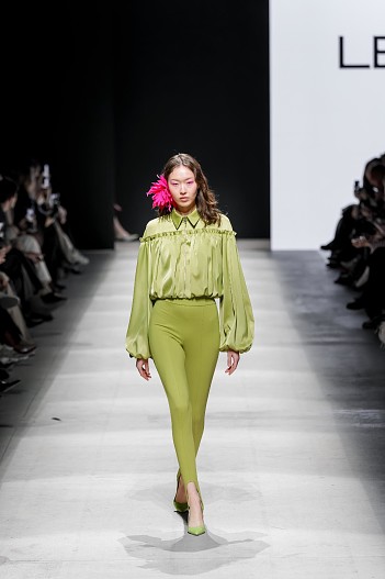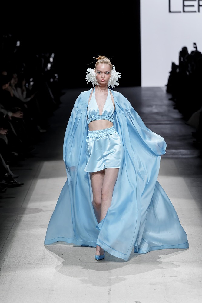В этой коллекции LEFFERS делает «реверанс» в сторону спортивного шика, но в авторском гламурном прочтении: шорты в боксерском стиле, топы-бралетты и бомберы с объемными рукавами сшиты из плотной атласной ткани, что привносит в образ дух женственности.