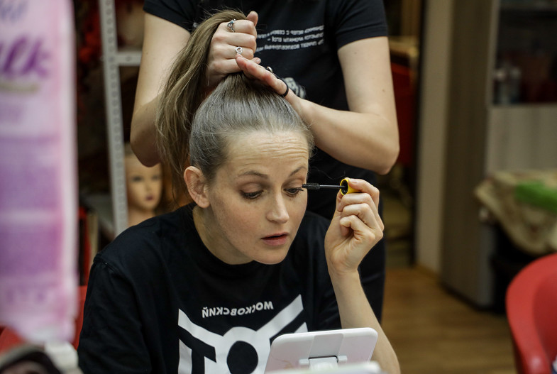 Яна: Сначала грим занимал где-то час. Но по мере того, как репетировали, я поняла, что смогу играть премьеру без грима. Так и сказала гримерам. Седых волос у меня прибавилось. Вот, с левой стороны у меня уже своя седина, а правая, зараза, пока никак не поседеет, надо еще порепетировать немножко (смеется). Настолько эта работа была мучительна (но только эти мучения со знаком плюс), настолько трудна … В общем, сейчас грим занимает минут 20. Самое главное в гриме – найти настоящую седину. Очень заметно, когда седина фальшивая. Таня, наш гример, еще и художник, поэтому она просто картину на мне рисует, добиваясь настоящего живого цвета и света седины. И когда зритель эту седину видит, то сразу начинает верить.