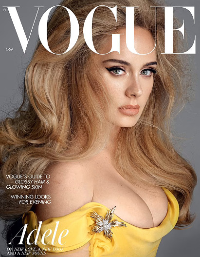 На новых фотографиях певица выглядит роскошно. На обложку попал кадр, где Адель позирует в желтом платье Vivienne Westwood, которое подчеркивает ее роскошную грудь.