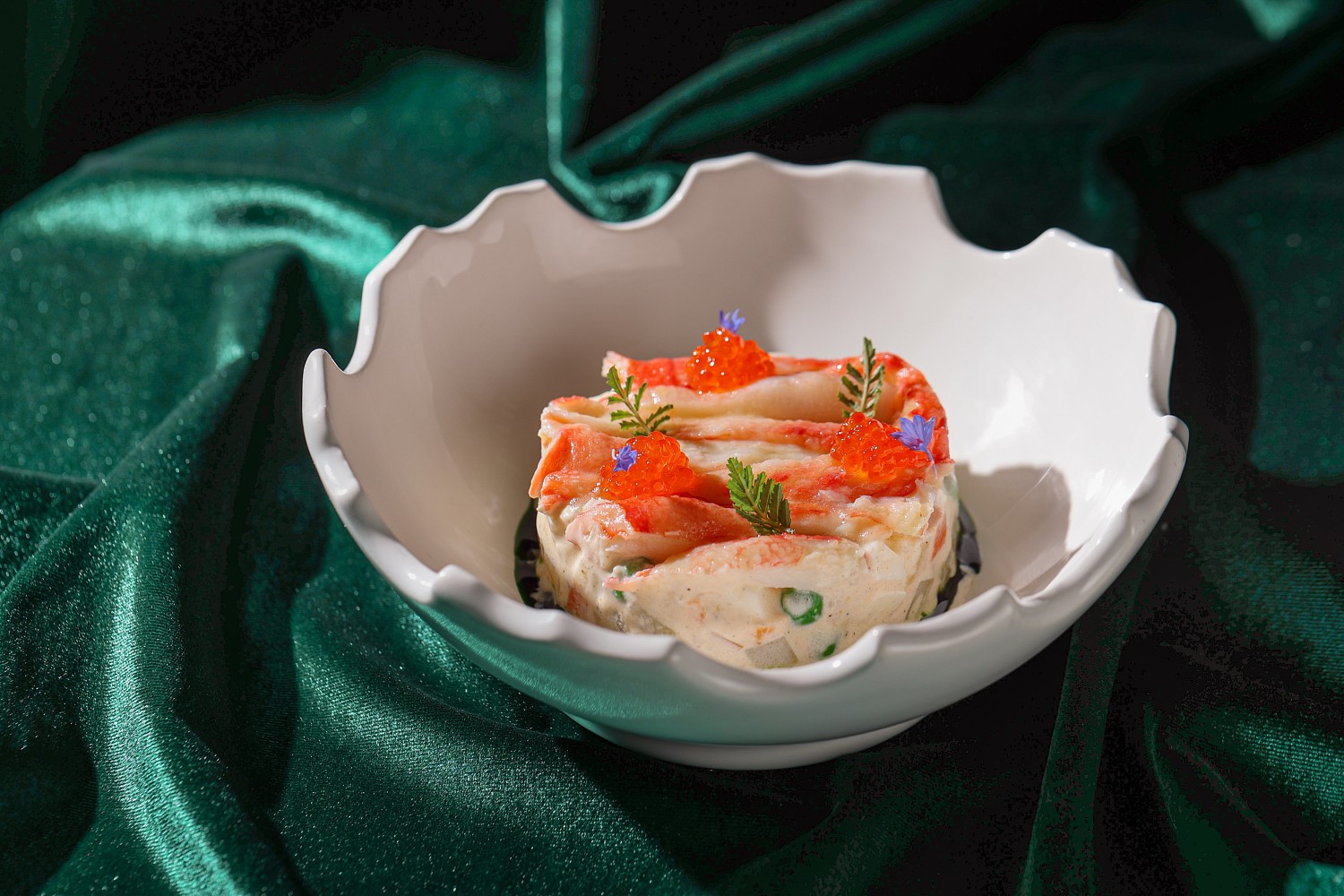Главный салат праздничного стола – «Оливье» – подают с камчатским крабом. А также в меню два вида тостов: с красной икрой и сметаной и с тремя видами икры.