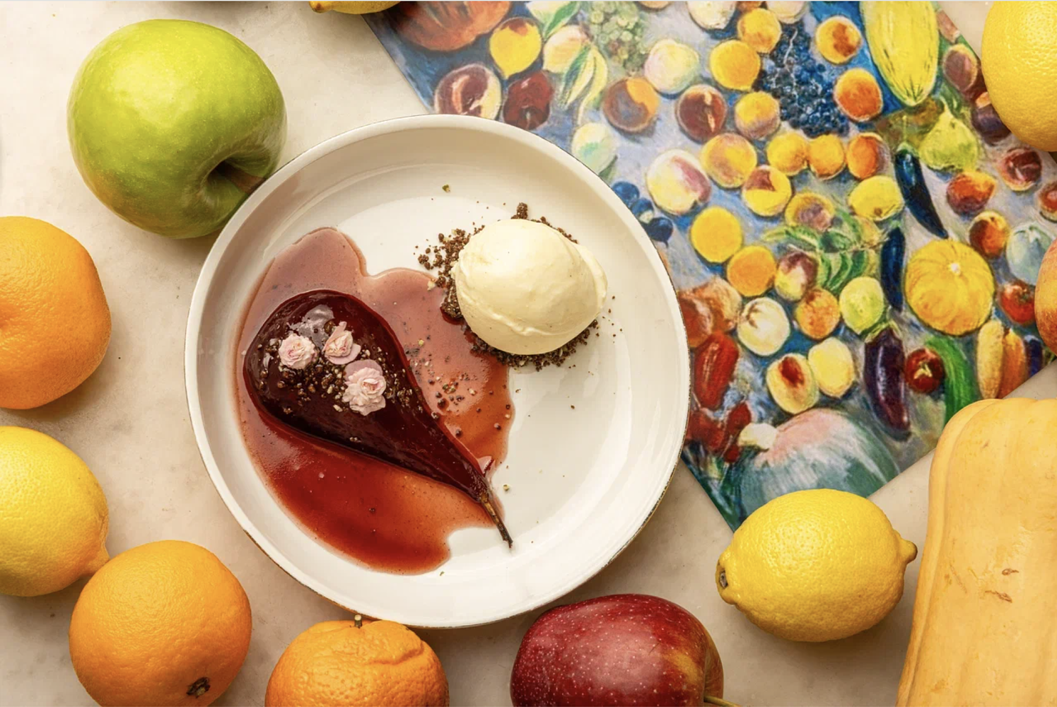 - Груша в вине, сливочное мороженое и тыквенное печенье — сладкая кульминация меню, как финальные аккорды зрительного и вкусового путешествия по трём рекам;