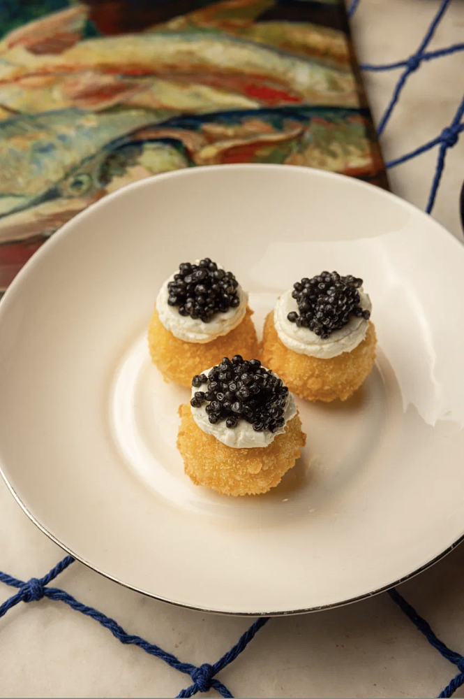 - Картофельные крокеты с солёным сырным кремом и икрой осетра — аллюзия на речные дары Волги, воспетые в живописи Владимира Кашкина;