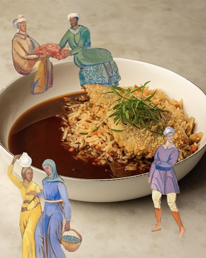 - Томлёный барашек с рисом, азиатскими специями и демиглясом — динамика расширяющихся художественных горизонтов, перекликающаяся с панно Павла Кузнецова;