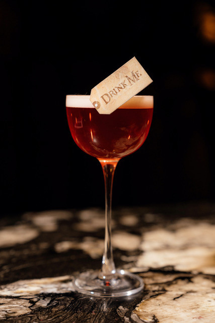Коктейль Drink Me — прямая отсылка к той самой бутылочке из сказки, после которой привычный мир меняется, и начинается чудо. В бокале — джин, свежесть арбуза, легкая горчинка апероля и ананас, настоянный на ройбуше.