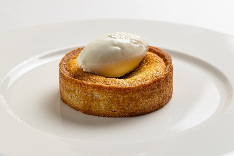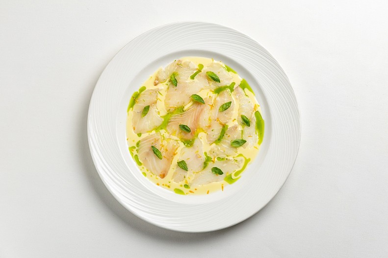- Карпаччо из сибаса с цитрусовым соусом и базиликом.
