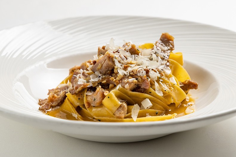 - Паппарделле с утиным рагу, травами, пармезаном и кедровыми орешками.