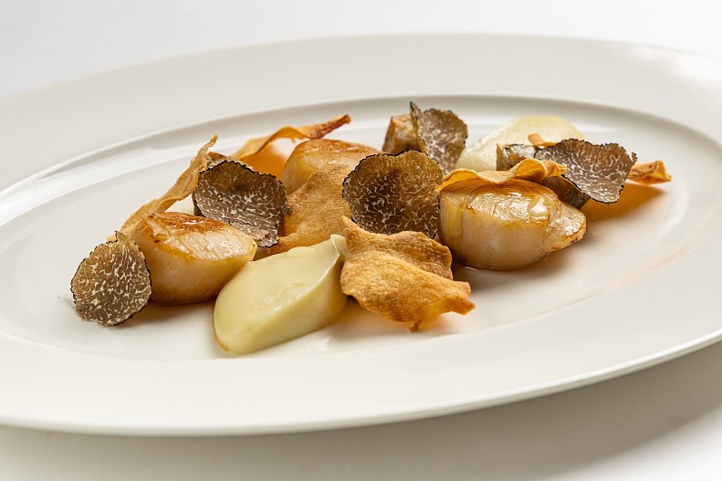 - Жареные морские гребешки с топинамбуром и трюфелем.