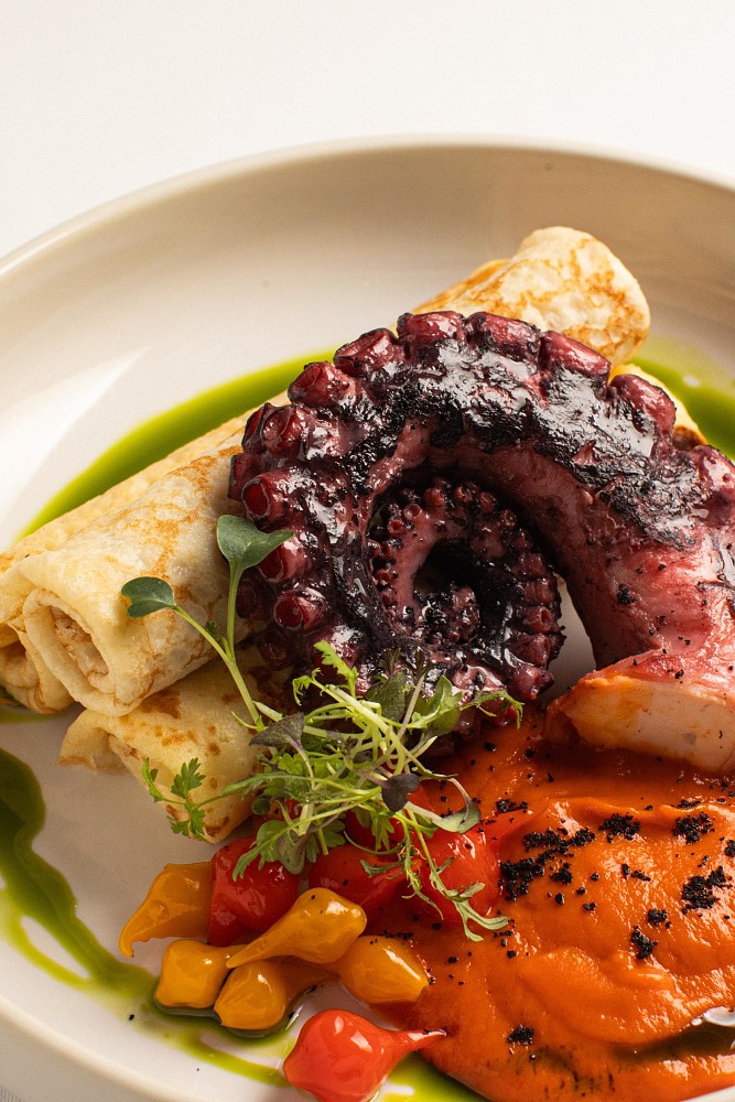 Для любителей глубоких, насыщенных вкусов в меню есть блины с риетом из утиной ножки конфи — запеченные под сыром, с вишневым соусом и свежей малиной, где сладость и кислинка балансируют плотную текстуру утки. Эту линию продолжает блюдо с риетом из красной рыбы и краба: черные блины с чернилами каракатицы, соус на основе белого вина и нежное крабовое мясо создают сложное, почти гастрономическое высказывание.