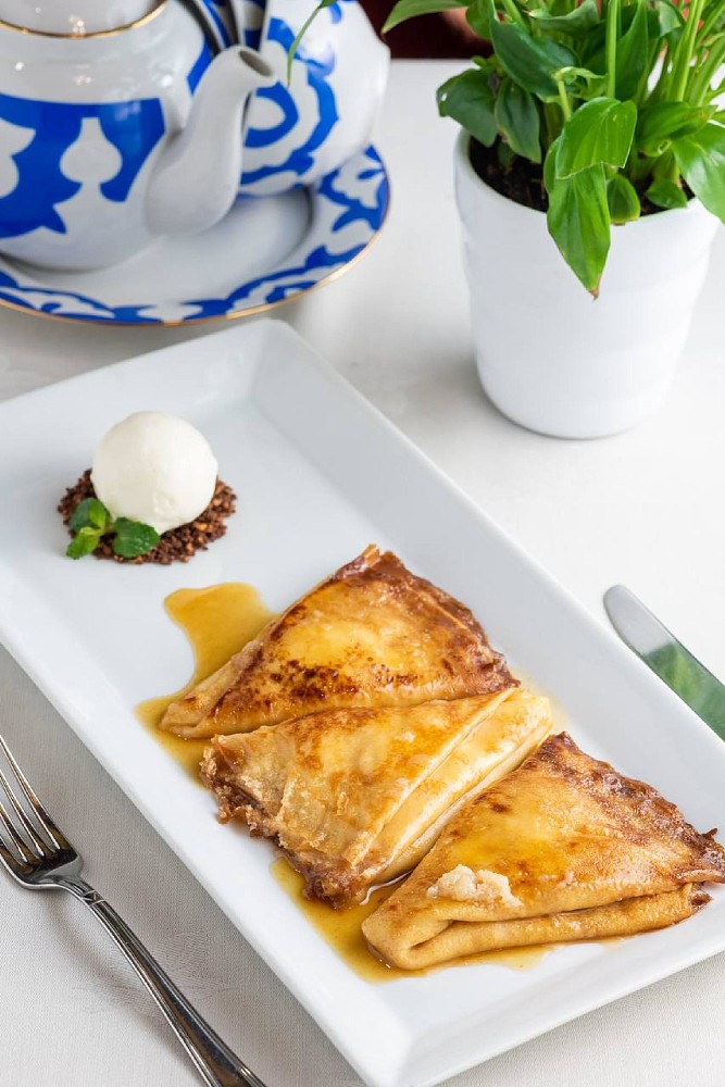 - креп Сюзетт с апельсиновым соусом и пломбиром;