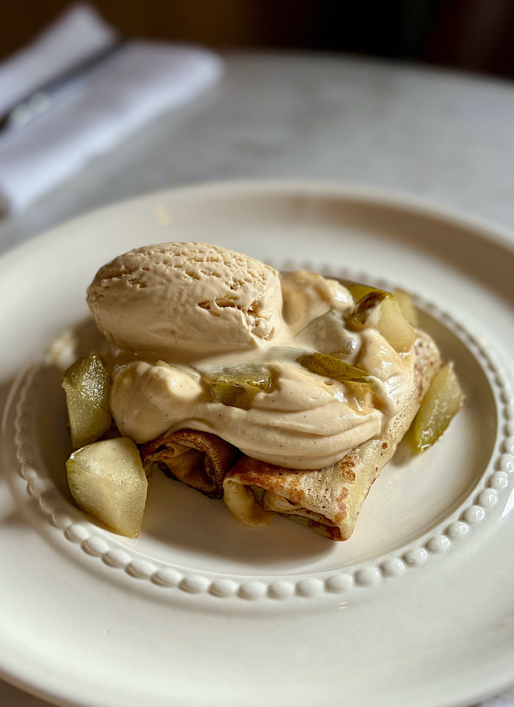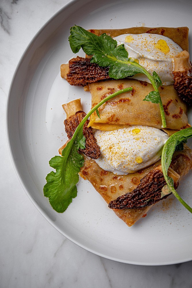 В винном бистро Nouge на Покровке идейный вдохновитель и сооснователь Станислава Кормановская разработала тонкие и ажурные блины на любой вкус: с креветками и сливочным соусом с сыром Горгонзола, с грибами, курицей, соусом бешамель и пармезаном, а на десерт — классические блины во французском стиле — креп-сюзетт с карамельным яблоком и апельсиновым ликером.