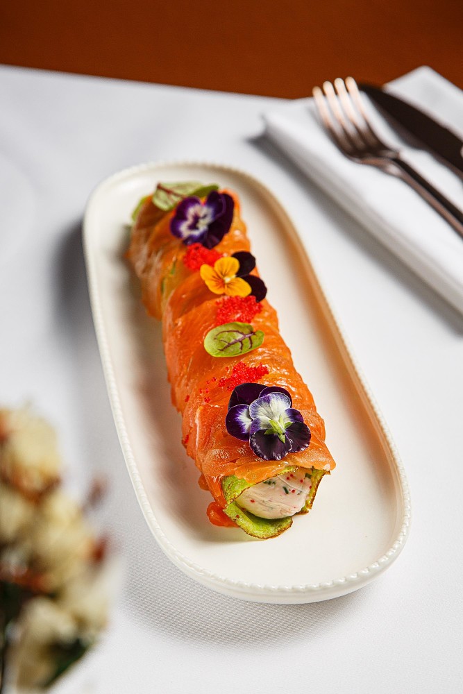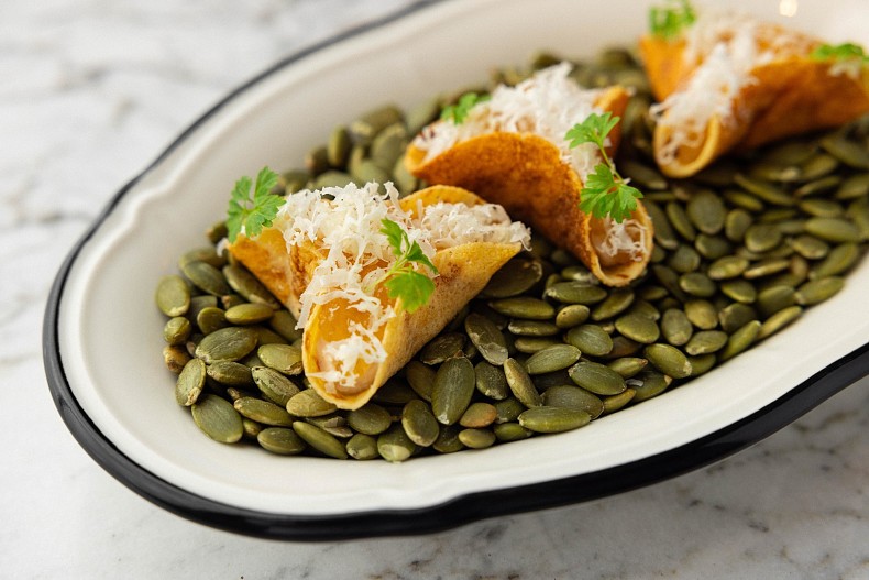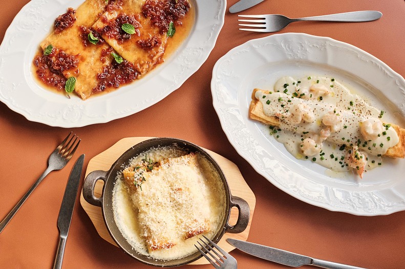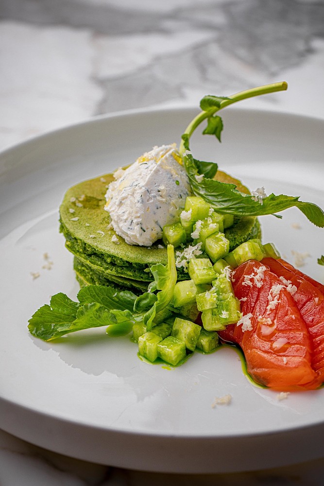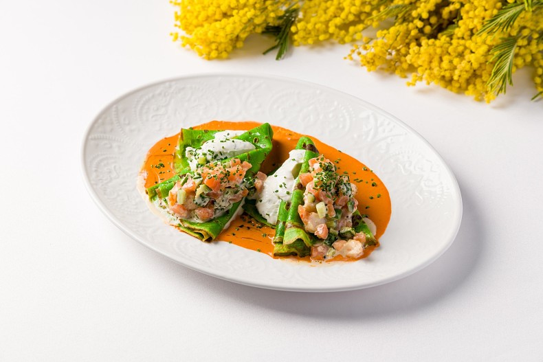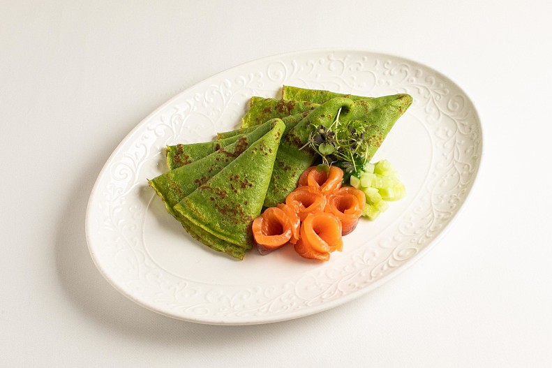 Так, румяные блинчики с ростбифом подают с насыщенным соусом из белых грибов — плотным, согревающим, словно созданным для поздней зимы. Более легкий, но не менее выразительный вариант — зеленые блины со шпинатом, в которых сочетаются слабосоленый лосось, рубленые жареные креветки и свежий огурец, а сливочный соус том ям добавляет неожиданную пряную ноту.