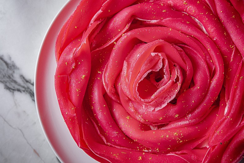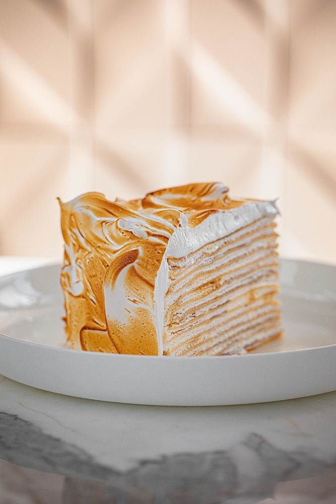 Десертная Масленица в «Сахалине» — блинные торты: с мягкой меренгой и соленой карамелью или торт с цветами сакуры и вишневым кули, сложенным в красную розу.