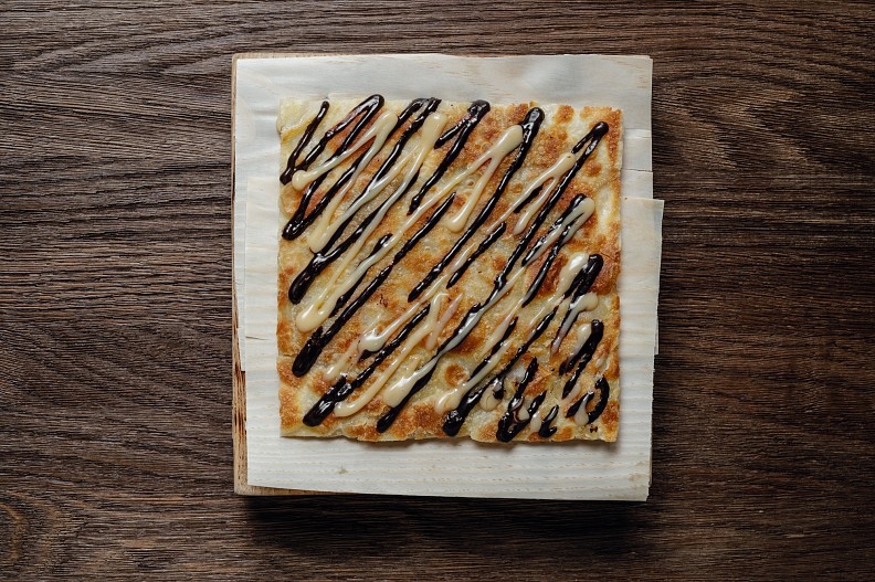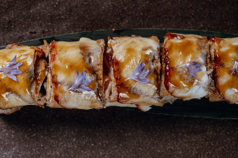 В Масленичном меню три авторские позиции. Индийские блины роти готовят по классическому рецепту — со сливочным маслом и сгущенным молоком, а подают с бананом. Тонкие гречишные блины сворачивают в форме маки-роллов с лососем, угрем, творожным сыром и соусом унаги. А пышные пшеничные блины подают с начинкой из вагю с имбирем, пекинской капустой и соусом понзу.