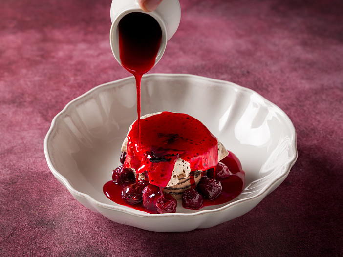 Нежный десерт с кремом из маскарпоне и креметте, двумя видами шоколадного соуса, свежей малиной и голубикой. Лепестки миндаля и сублимированная малина добавляют текстуру и яркий акцент.