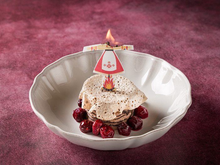 Денис Комляков, шеф-кондитер Levantine, всю масленичную неделю выпекает порционные блинные торты. Десерты украшают фигурками Масленицы, которую перед подачей эффектно поджигает официант.