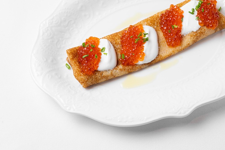 Масленица по-богатому — это блины с крабом в белом соусе и красной икрой. С такими блинчиками не возбраняется поднять бокал игристого или рюмку с ледяным исконно русским напитком.
