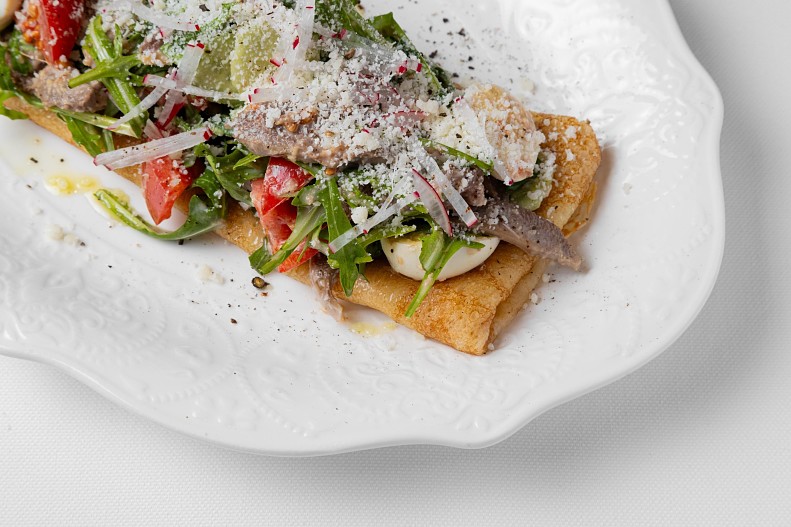 Позиция номер один в специальном предложении — блин с соусом виттело. В этом блюде объединилась легендарная итальянская закуска и русские блины. Подается с мини-каперсами и итаджасскими оливками.