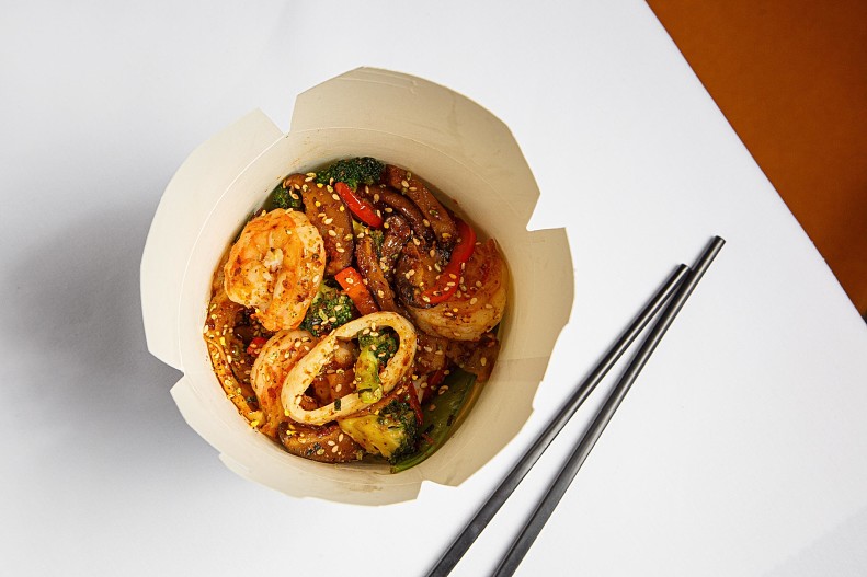 Удон из блинов с креветками и кальмаром — блюдо в формате блинного удона с морепродуктами и овощами в фирменной коробке вок от «Бибирево».