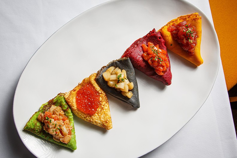 Блины «Пять морей» —  ассорти блинов с разными морскими начинками: лосось, сибас, тунец, гребешок и красная икра.
