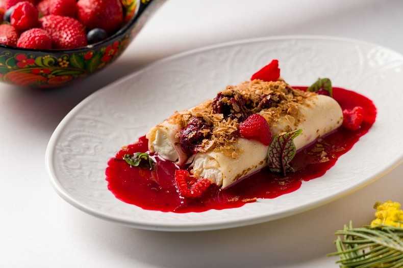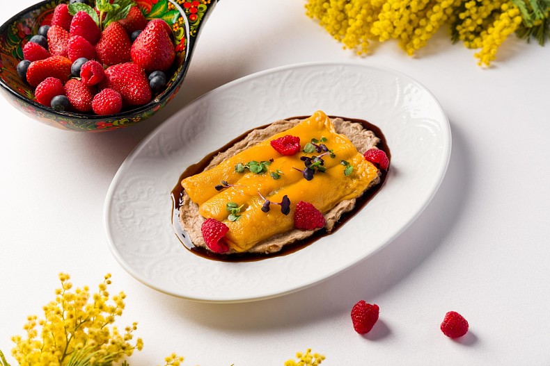 Не забыли в «Кафе Чайковский» и о десертной стороне Масленицы. Налистники с начинкой из двух видов творога и апельсиновыми цукатами запекают под ароматным апельсиновым соусом, а блины с «пьяной» вишней, крем-чизом и белым шоколадом подают с вафельной крошкой и малиной — как финальный аккорд масленичного застолья.