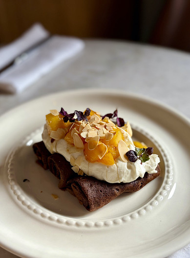 Шеф-кондитер ресторана Фатима Салех, в свою очередь, приглашает попробовать особый блинный торт, вдохновленный вкусом миндального круассана. Между тонких блинчиков — крем на основе ванильного ганаша с добавлением миндальной пасты и дробленого миндаля. Сверху торт украшен обжаренными миндальными лепестками с сахарной пудрой и шариком кофейного мороженого с добавлением апельсиновый цедры. Немного посыпки в виде молотого кофе — и прекрасный десертный вариант к Масленице готов, и уже ждет своей пары — чашки свежезаваренного чая или ароматного кофе.