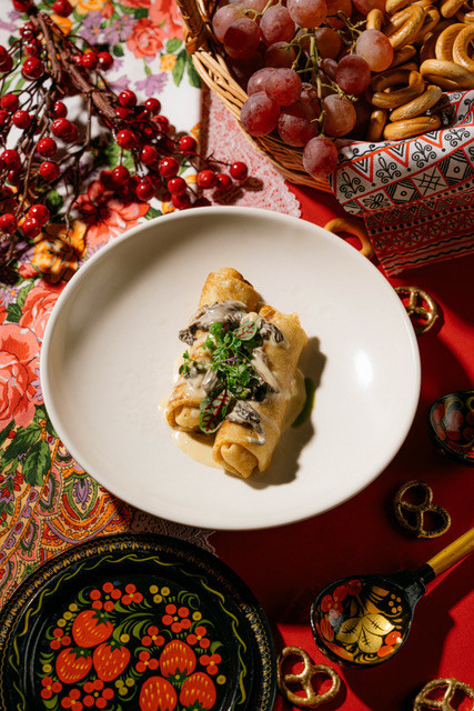 Блины с мясом и сморчками, оладьи со шпинатом и лососем, торт блинный с меренгой и торт-роскошная роза — Масленица в ресторане «Сахалин» — это безусловное гастрономическое событие.