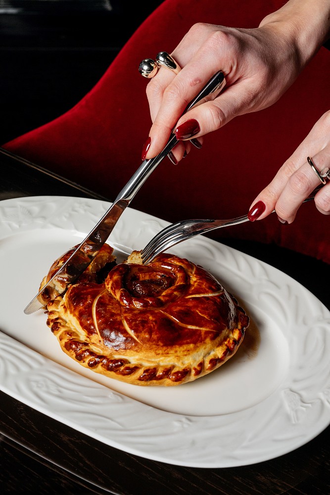 Карпаччо из dry aged пиканьи раскрывает тонкий, почти кремовый вкус выдержки, где каждый срез — о точности и качестве исходного продукта. Тартар из говядины с солёным желтком и луком- пореем подчёркивает природную сладость мяса и его бархатную структуру. Пирог с оссобуко и костным мозгом — насыщенный и глубокий вкус, с ярко выраженным мясным характером и тёплым обволакивающим послевкусием.