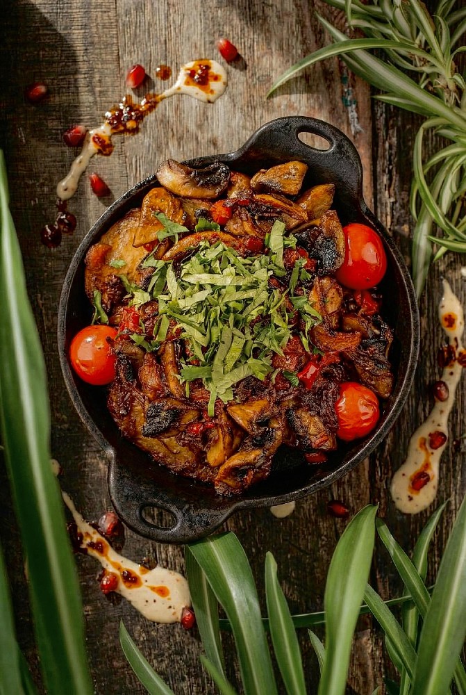 Горячие блюда — это комфортная еда, где постные ингредиенты звучат по‑настоящему сытно. Чечевица появляется и в супе, и в нежном креме из паровых овощей — для глубины и мягкости. Баклажан с аджикой, жареные кабачки и овощи на гриле дают тот самый южный огонь, а гречка с белыми грибами и жареный картофель с белыми грибами отвечают за «домашнюю» насыщенность и аромат леса. В меню много блюд, которые в «Шинке» особенно любят: ушки с грибами и булгуром в бульоне, голубцы с грибами и луковым соусом, галушки с грибным кремом — знакомые формы, но выверенный вкус и аккуратная подача. Десерты Елена Никифорова оставила такими, чтобы завершение было лёгким и праздничным: апельсиновый пирог с брусникой — про яркость и кислинку, торт с кремом «кокос‑лайм» — про нежность, а сорбет лимон‑лайм — освежающий финал.