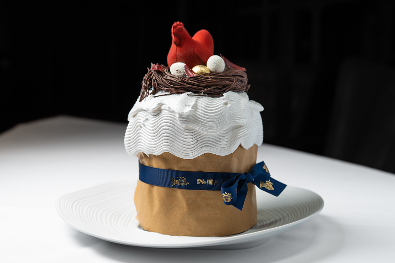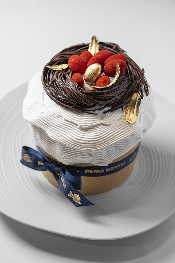 В панеттоне, который перед отпеканием расстаивают 12 часов, добавляют домашние апельсиновые и лимонные цукаты, янтарный изюм и курагу. В завершение его покрывают той же лимонной глазурью, эффектно уложенной волнами, и декорируют шоколадным гнездом с красной курочкой из темного шоколада, белыми и золотыми «яйцами» и воздушными «перышками».