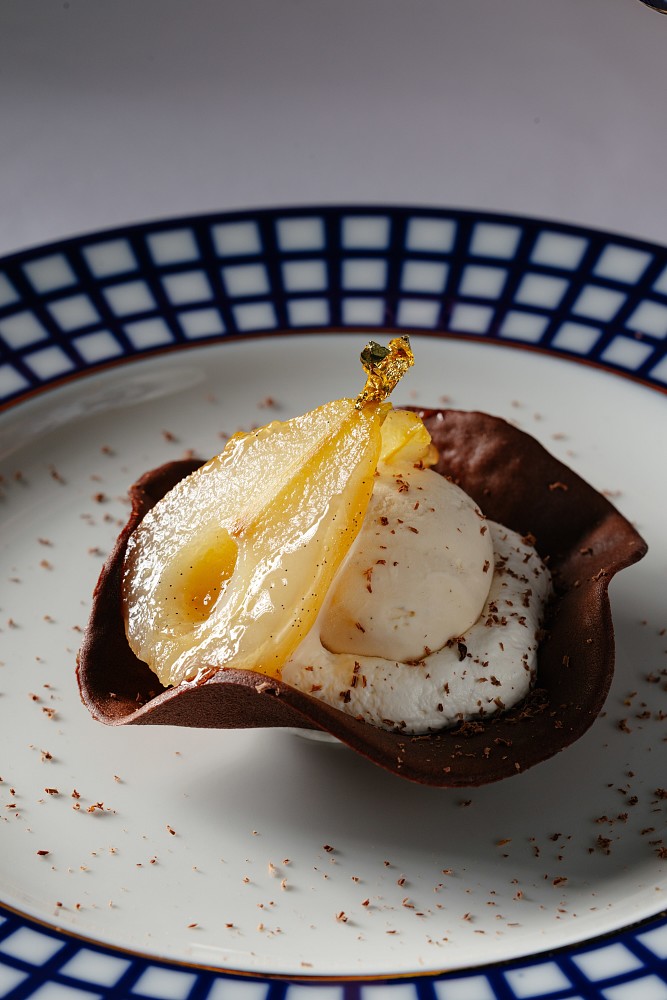 Авторство Груши «Прекрасная Елена», рецепт которой вошел в мировую кулинарную книгу, приписывается Огюсту Эскофье — одному из создателей современной высокой кухни, визионеру, совершившему революцию в управлении и маркетинге ресторанного бизнеса, а также в организации ресторанной кухни. «Король поваров и повар королей» Эскофье создал сотни блюд и также бульонные кубики Maggi, что стало первым в истории сотрудничеством шеф-повара и пищевой промышленности. Маэстро утверждал, что «в искусстве повара главное, чтобы ресторан полюбили женщины» — поэтому изобретал десерты в их адрес: персик Мельба в честь австралийской певицы Нелли Мельбы, а позже тост Мельба, клубнику Сары Бернар и Грушу «Прекрасная Елена». В гостинице «Астория» веточка груши декорируется сусальным золотом — и его тоже непременно можно скушать.