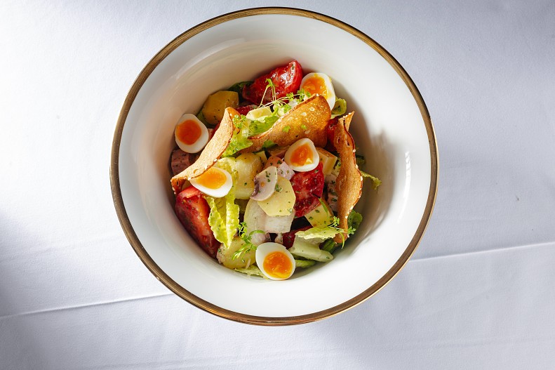 В сезонном меню «Астории» представлена основная иерархия блюд: от холодной закуски до супа, горячего и десерта. Парижский салат — это микс овощей и зелени с окороком и сыром грюйер, сервированный с перепелиными яйцами и прозрачными хлебными чипсами.