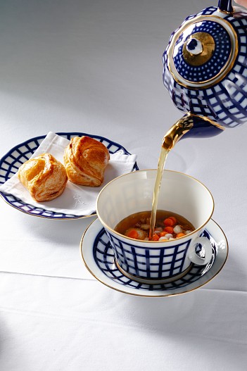 Консоме Монте-Карло по моде дореволюционной России подается с миниатюрными слоеными пирожками с мясом: они подчеркивают вкус этого крепкого бульона с морковью, корнем сельдерея и куриными кнелями.