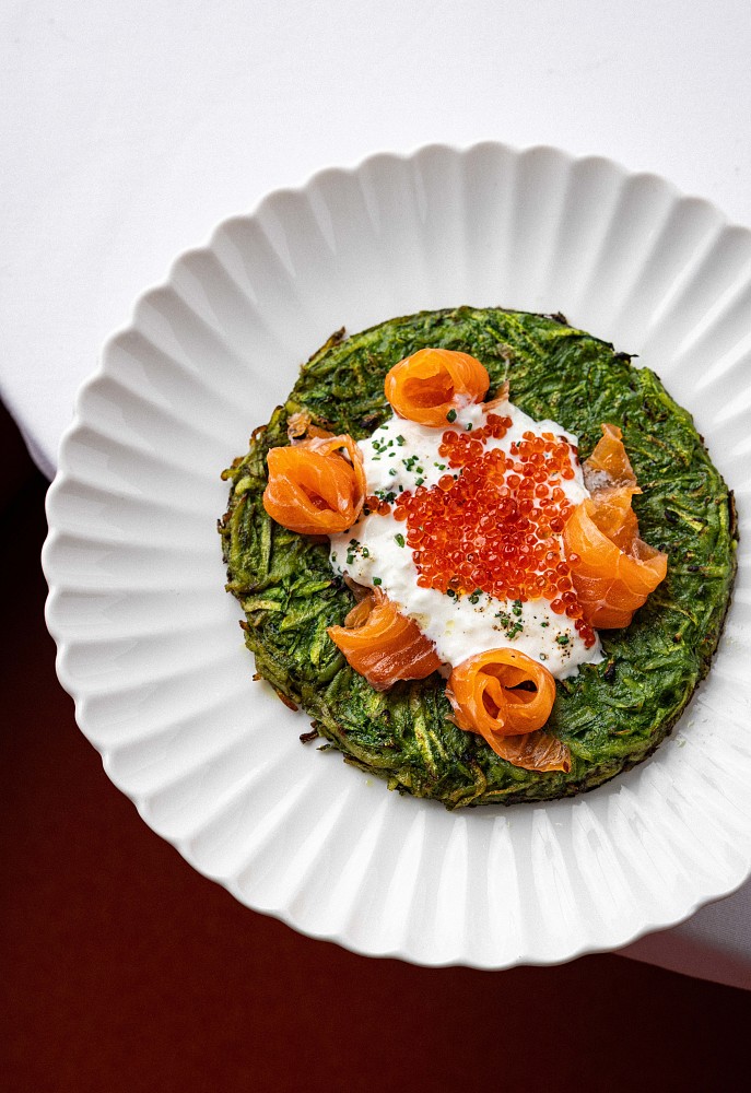 Особое внимание стоит обратить на запеченный камамбер в тесте фило с трюфелем, драник с тартаром из говядины или яичницу с морепродуктами, томатами и шпинатом.