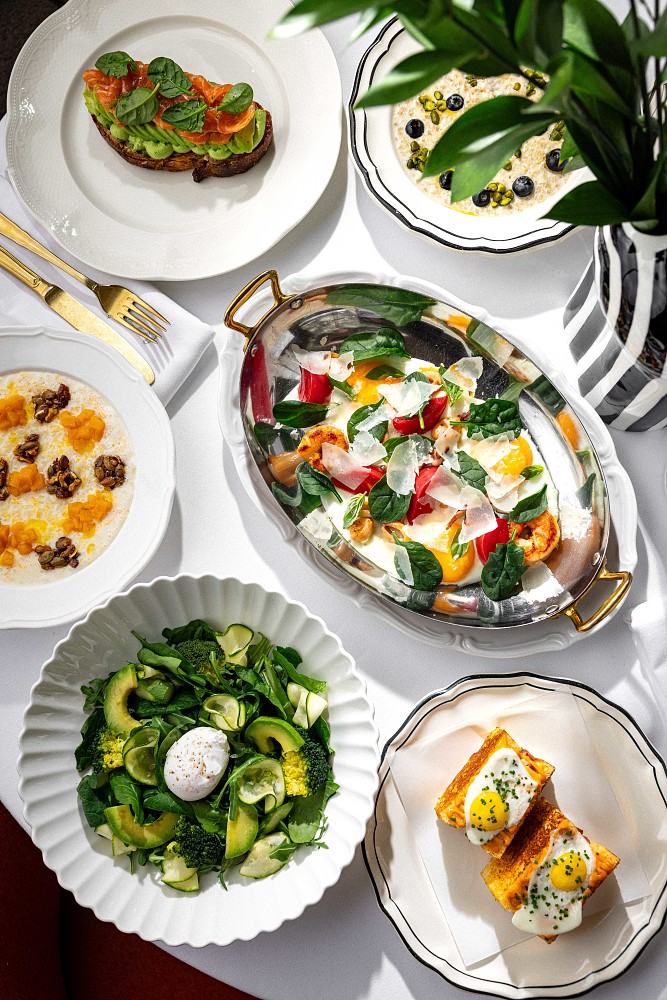 Легкие мезе, которые подойдут к продолжительным завтракам за бокалом игристого, популярный зеленый салат в южной интерпретации с авокадо и авторской заправкой от шефа, а также многообразие блюд из яиц, которые всегда присутствуют на утреннем столе.