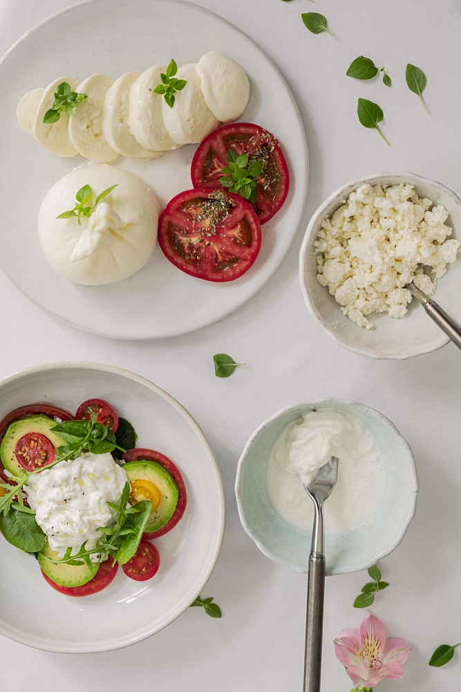 - салат со страчателлой, томатами, авокадо и мусс из шпината;