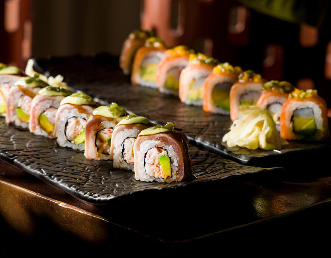 Из меню роллов рекомендуем ролл с крабом и лососем и ролл с опалённым лососем и юдзу.