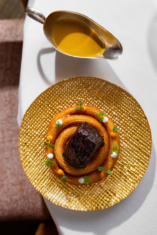 Чуррос с ребром, карри и чёрным чесноком — реинтерпретация традиционного испанского десерта чуррос через призму индийских специй и ферментированных ингредиентов .