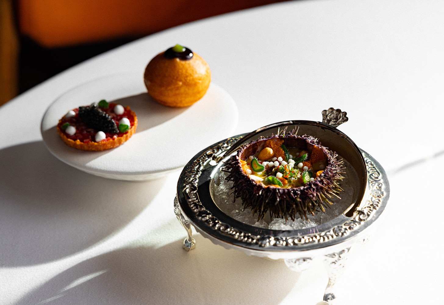 Выдержанный бычок с чёрной икрой, Пончик даси с лобстером и тамариндом, Севиче из морского ежа Выдержанный бычок с чёрной икрой, Пончик даси с лобстером и тамариндом, Севиче из морского ежа