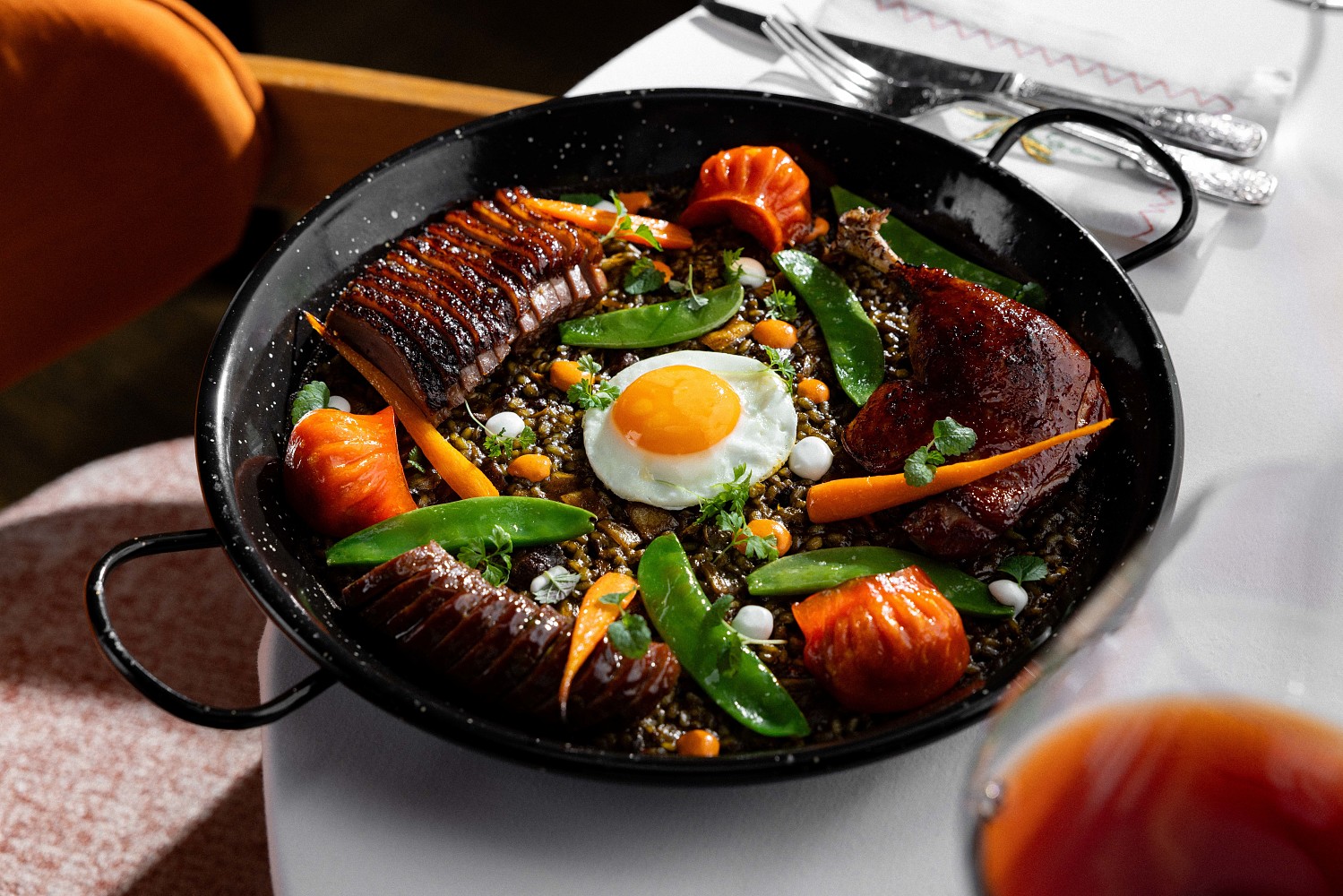 Паэлья кимчи с уткой хойсин — диалог Испании и Кореи: традиционная техника приготовления паэльи объединяется с ферментированным кимчи и китайским соусом хойсин.