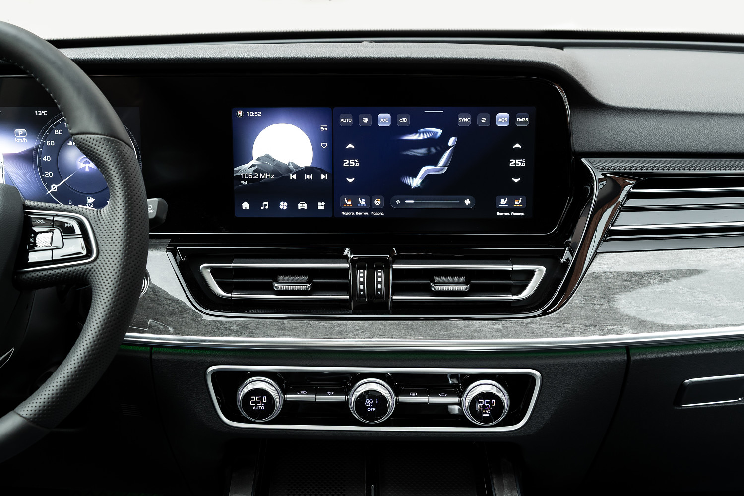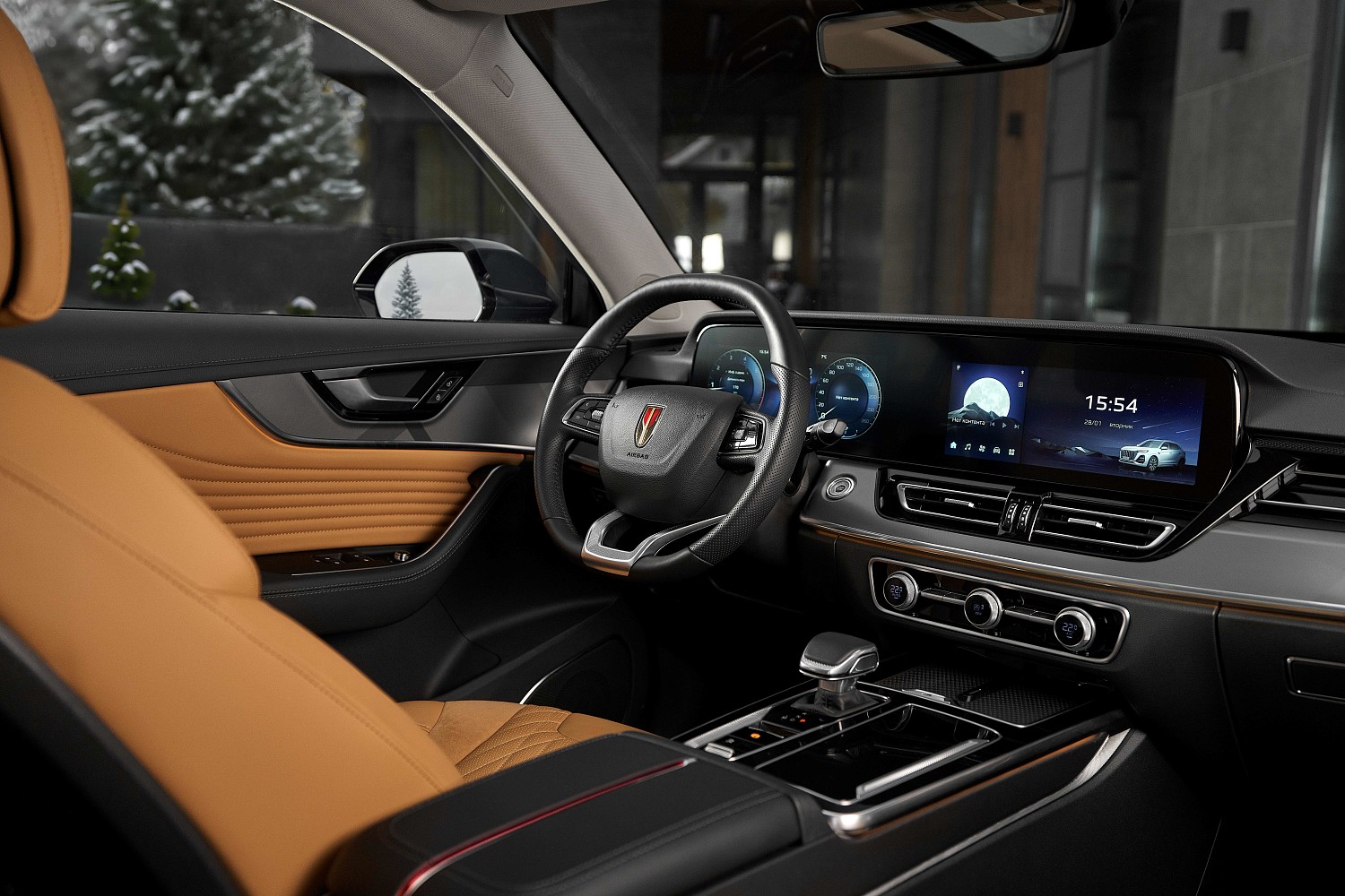 В стильную переднюю панель органично вписаны два широкоформатных дисплея диагональю 12,3 дюйма, есть также проекционный экран, на который выводится вся основная информация о движении. Аудиосистема премиум-класса известной фирмы Bose состоит из 12 динамиков, а на снижение уровня шумов и вибраций направлен целый комплекс мер. Комфортабельную атмосферу внутри Hongqi HS5 создает контурная подсветка с возможностью выбора цветов — всего их 253.